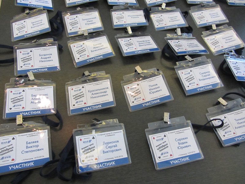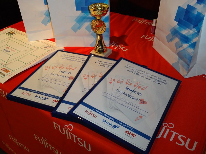 14 марта 2015 г. состоялся XI межрегиональный турнир по спортивному преферансу среди ИТ-специалистов «поПУЛЯрные технологии». Более 40 участников из Нижнего Новгорода, Уфы, Самары, Дзержинска и Казани приняли участие в борьбе за призовые места. Организатором турнира выступил системный интегратор ЦКТ «МАЙ» при поддержке партнеров Fujitsu и APC.