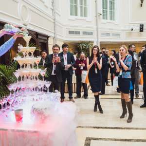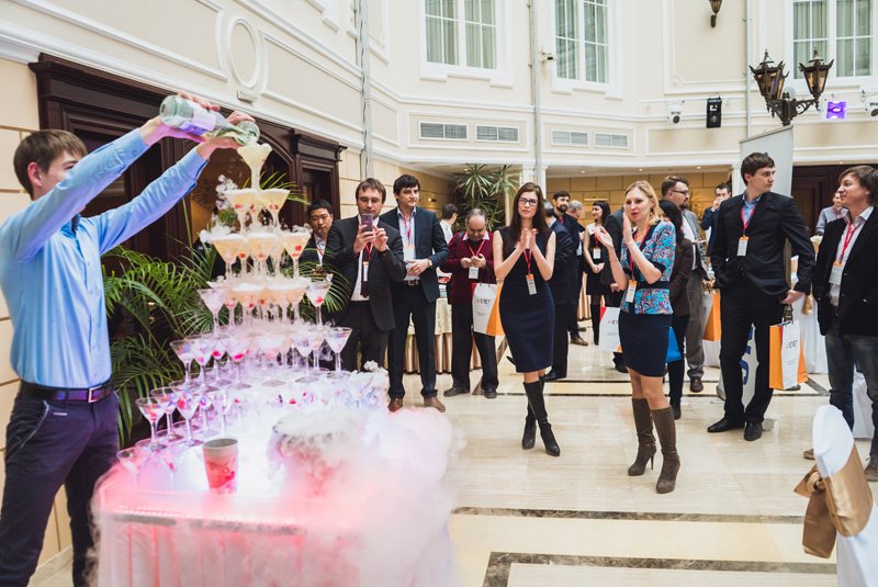 Торжественное открытие семинара началось с грандиозной пирамиды из шампанского, фонтана с шоколадом и изысканной закуски.