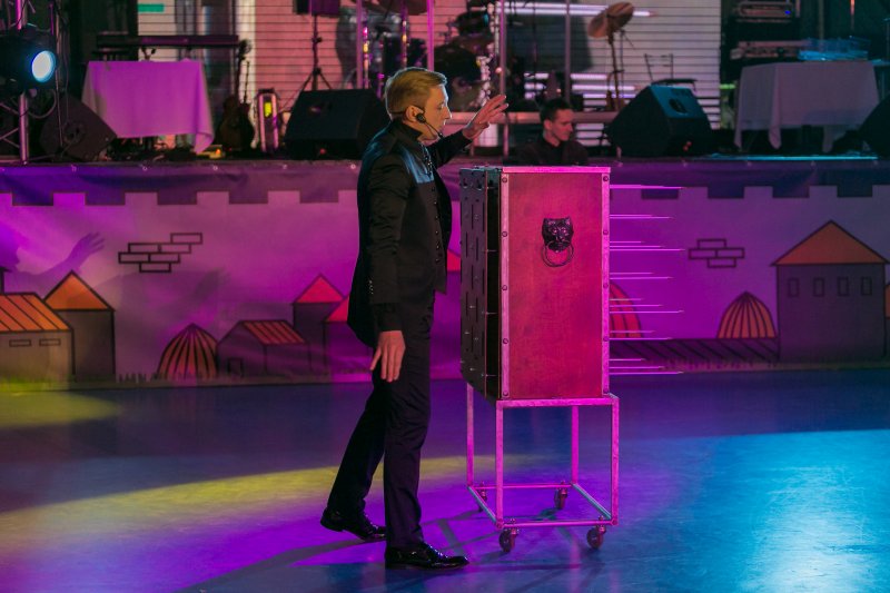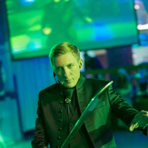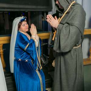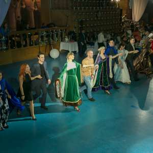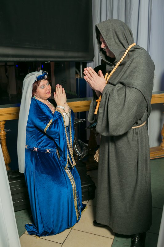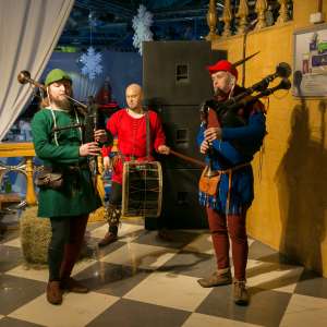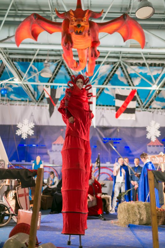 Прямо посреди банкетного зала, как по волшебству, вырос средневековый городок с его обитателями — бряцающими доспехами рыцарями, благородными дамами, поражающими друг друга и окружающих красотой нарядов, таинственными жителями и парящим над крышами домиков драконом.