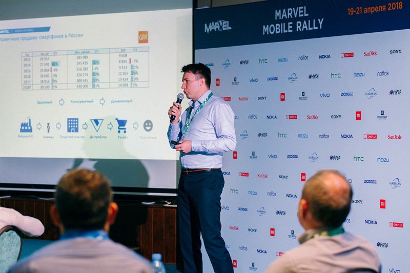 Деловая часть мероприятия началась с выступления представителей компании «Марвел»: вице-президента по розничной дистрибуции Антона Черепахина и директора департамента «Мобильные средства связи» Павла Вьюкова. «Доля „Марвела“ на рынке мобильных устройств в России составила 14% в 2017 году, т.е. каждое седьмое проданное устройство прошло через нас. В 2018 году мы планируем продолжать наращивать объемы продаж и реализовать 7 миллионов мобильных устройств», — рассказал Павел Вьюков.