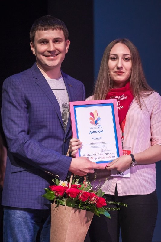 Победительницей конкурса стала экстравагантная Арина Чемисова, аналитик компании «Freematiq». Главный приз — современный гаджет Apple iPad, корону и диплом «Мисс ИТ −2018» вручил президент Алтайской ТПП Борис Чесноков.