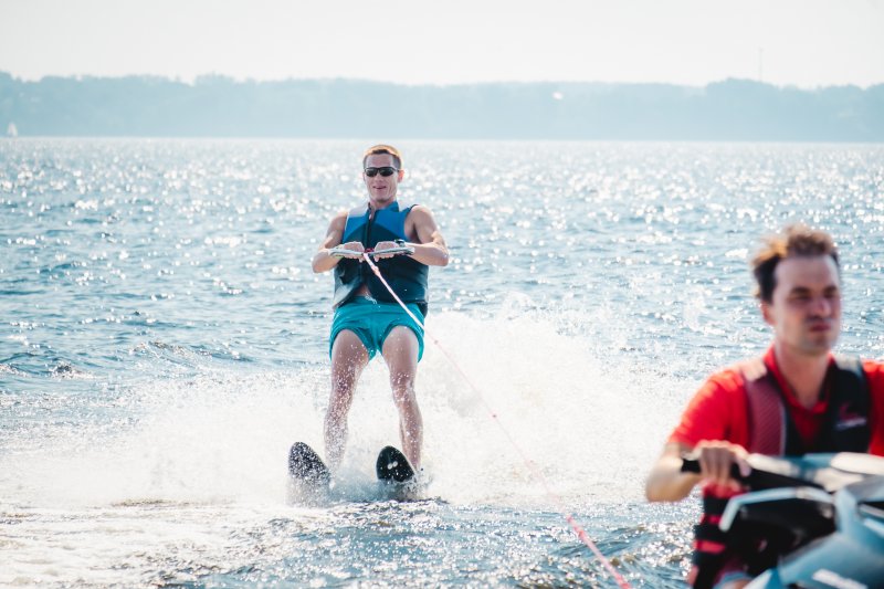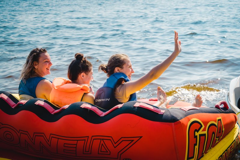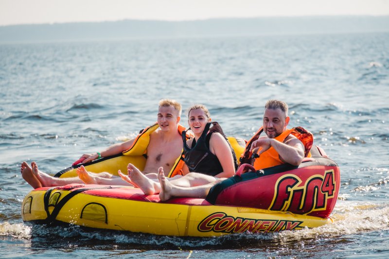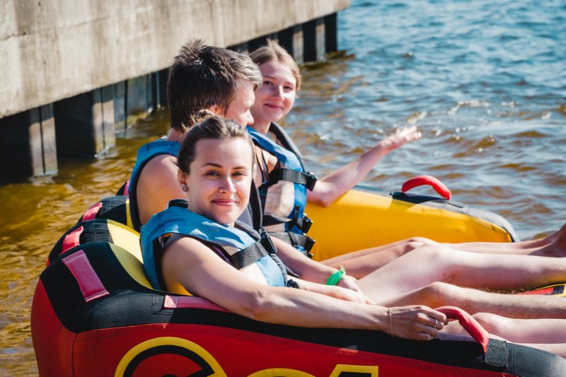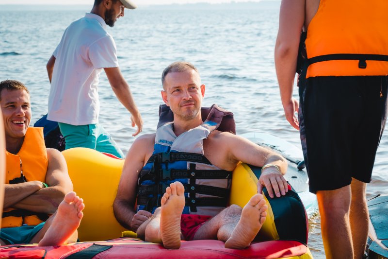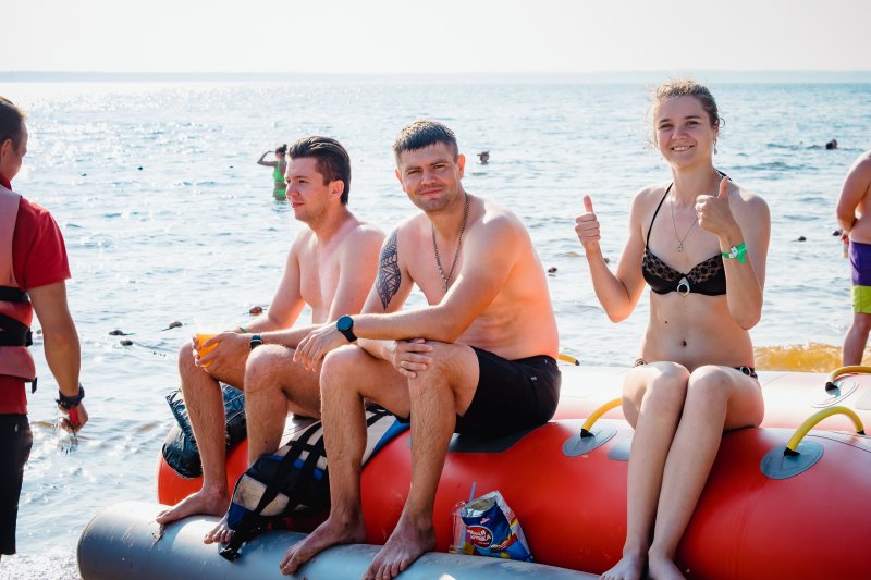 На территории базы отдыха располагается отличный пляж со множеством водных аттракционов. И следующая часть программы была посвящена именно этому. Катание на катере, банане, sup-борды, катамараны — каждый нашел занятие по душе.