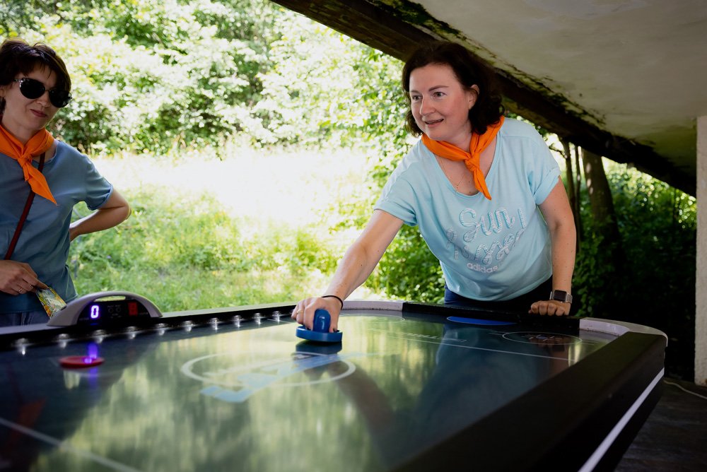 Параллельно с футбольным матчем на соседнем поле развернулись спортивные соревнования. Команды проходили локации поэтапно согласно маршрутному листу: аэрохоккей, волейбол, настольный теннис, мегатир, гигантский кольцеброс и дартс, командные лыжи, беличьи колеса, лодочки, сумоборье.