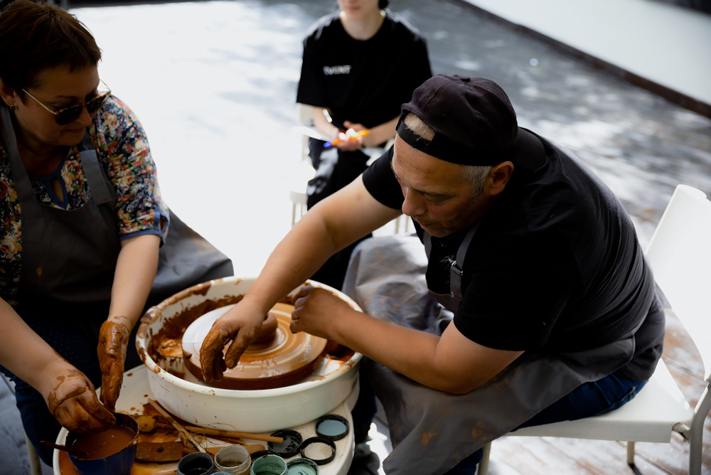 Для тех, кто любит более спокойный досуг, были организованы разнообразные мастер-классы. На большом панно можно было научиться технике стринг-арт и создать удивительную картину из гвоздей и ниток. Рядом расположились столы для росписи футболок и декорирования, а для грандиозного творчества была установлена стена, которую можно было расписать красками в стиле уличного искусства. Нашлось место и для выжигания по дереву и мастер-класса по гончарному мастерству. Под наблюдением опытного гончара из невзрачных комочков глины получались целые произведения искусства.