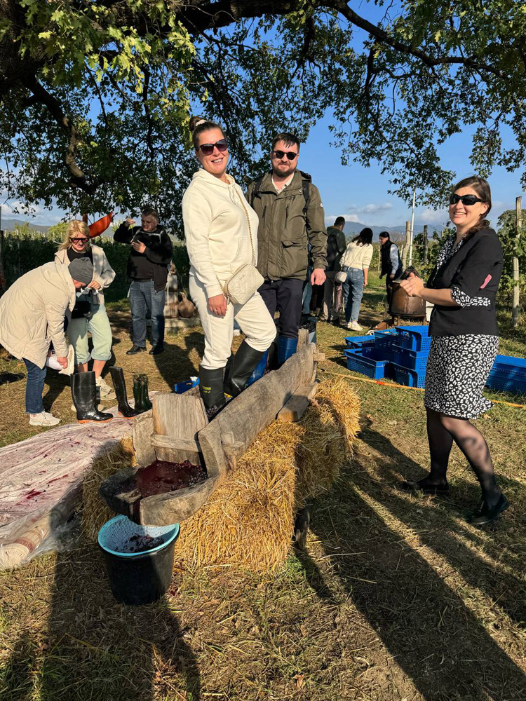 Особое внимание уделили процессу сбора урожая. Гости получили уникальную возможность самостоятельно собрать спелый виноград и даже принять участие в давке ягод традиционным способом — ногами.
