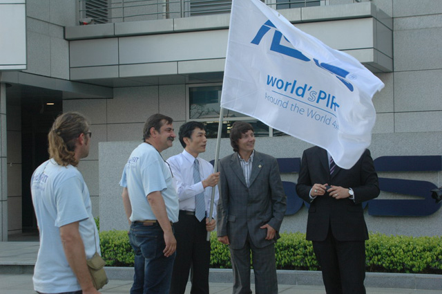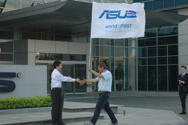 Участников экспедиции приветствовал глава корпорации ASUS Джонатан Тсанг. Командор кругосветки Владимир Павелко передал Джонатану Тсангу флаг ASUS, которой прошёл с экспедицией от нулевого километра на Красной площади Москвы.