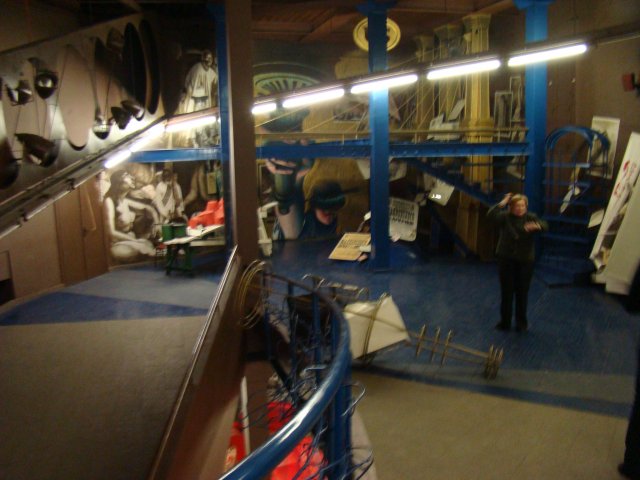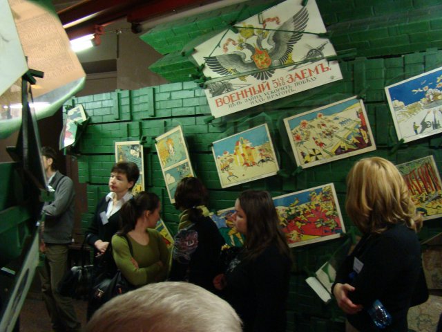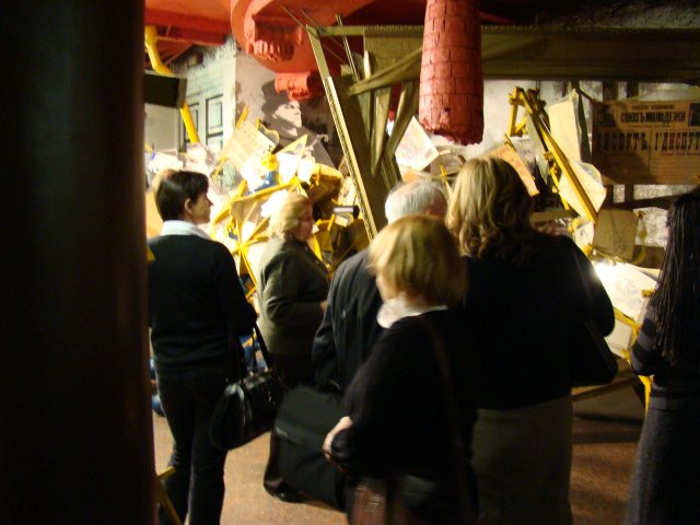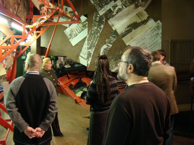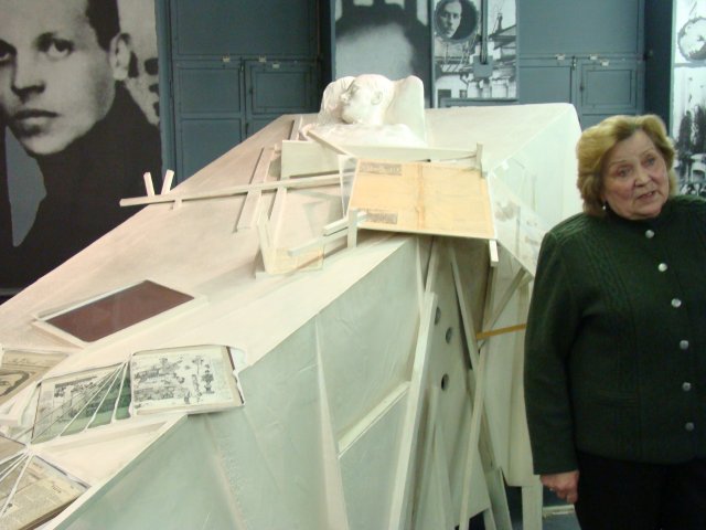 Участники встречи стали посетителями интереснейшей экспозиции музея, посвященной творчеству знаменитого поэта и искусству начала 20-го века. Экспозиция музея, открытая а 1989 году, создавалась экспериментальным путем, в нарушение всех традиций музейного дизайна. Это образно-символическая модель творческого мира и времени Маяковского. Здесь нет привычных застекленных витрин и полуприлавков с аккуратно разложенными в них экспонатами. Их заменяют пластические конструкции, похожие на театральные декорации. Экспозиция музея - это свободно перетекающее пространство, лишенное глухих перегородок и междуэтажных перекрытий. Ее центральным нервом является мемориальная лестница. Она ведет на 4 этаж в пространство бывшей коммунальной квартиры к маленькой комнатенке лодочке, где с весны 1919 года в течение 11 лет жил и работал Маяковский и где 14 апреля 1930 года прозвучал роковой выстрел <товарища маузера>, обозначивший «точкой пули» конец его жизненного пути.