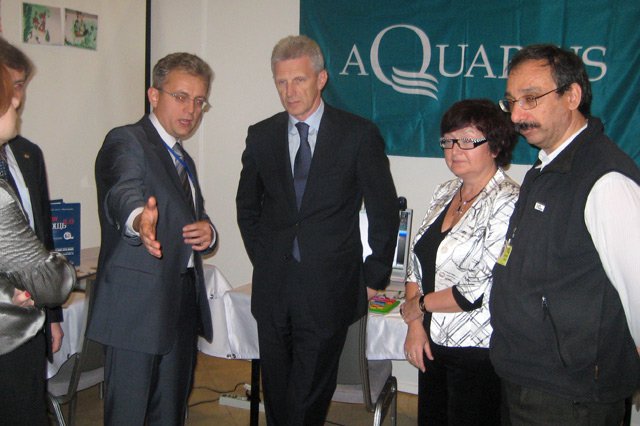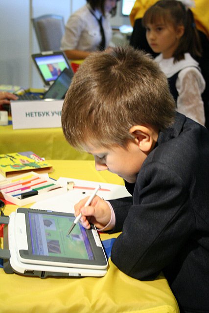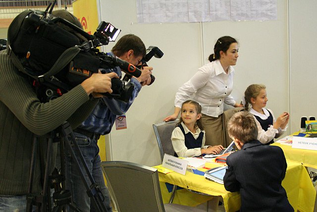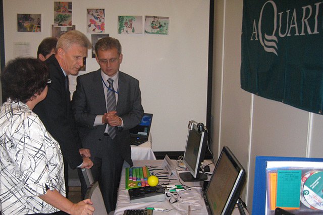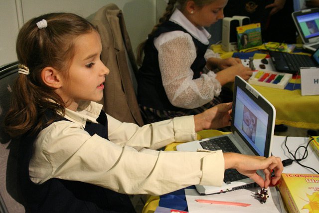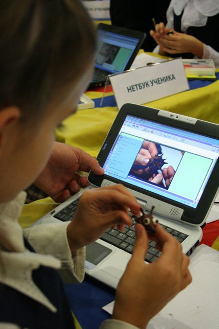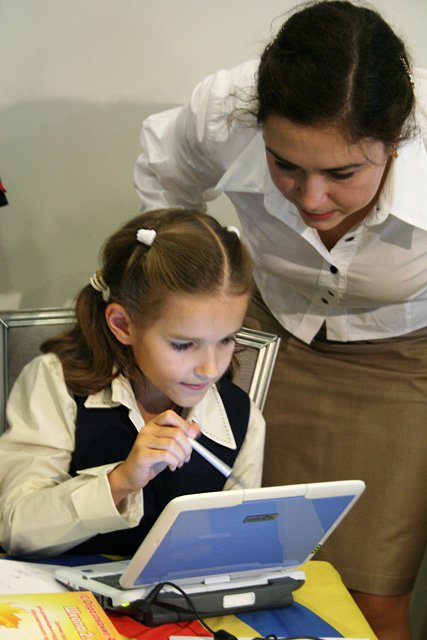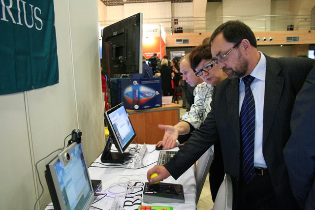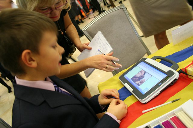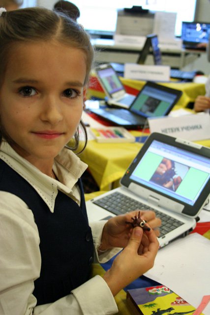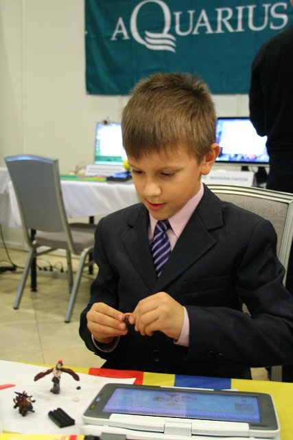 Дети уверенно работали за учебными ноутбуками Aquarius с поворотным сенсорным экраном с использованием лабораторных сред фирмы «1С» и лабораторных датчиков. Младшие школьники, используя «1С:Школа. Студия лепки. Животные», прослушивали сказку, выбирали животного и затем лепили его из пластилина, следуя пошаговым инструкциям на экране своих нетбуков. Далее ребята приняли участие в виртуальном путешествии в пространстве и времени, где узнали много нового о различных исторических периодах и уголках планеты Земля. Старшие школьники исследовали математические свойства парабол в творческой конструктивной среде «1С:Математический конструктор» и дыхание живых организмов в «1С:Лаборатория. Зачем мы дышим?». Результаты работы ребят были представлены министру образования и науки РФ А.А. Фурсенко и другим почетным гостям мероприятия.