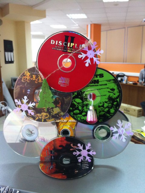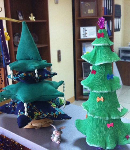 Здесь есть елки из гофры, мятой газеты, сетки, ткани, войлока, строительных материалов, перьев, бумаги и дисков - на любой вкус.