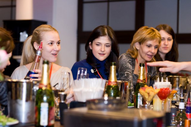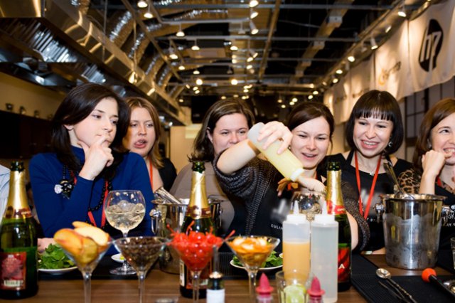 Но точку в мероприятии на этом ставить рано. Как говорится, show must go on… Своеобразный колорит вечеру придал мастер-класс по приготовлению коктейлей, во время которого бармены также поделились профессиональными секретами. Теперь участницы при случае смогут похвастать своими познаниями в искусстве приготовления и эффектной подачи коктейлей! А ещё в этот вечер дамы исполняли хиты под караоке, танцевали и фотографировались в антураже самой известной российской кухни.
