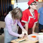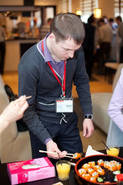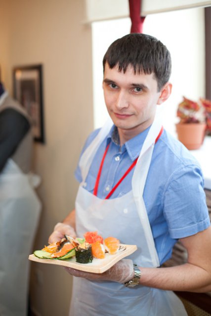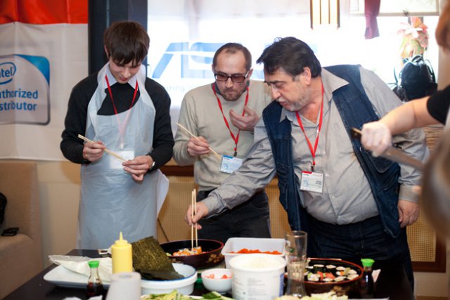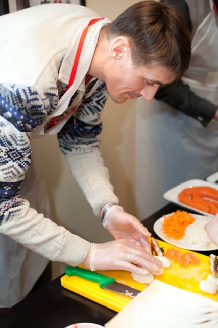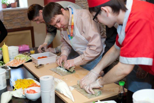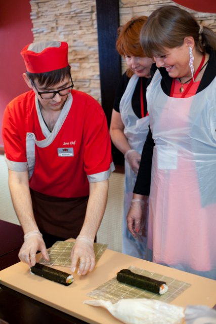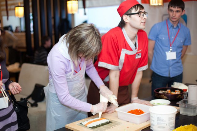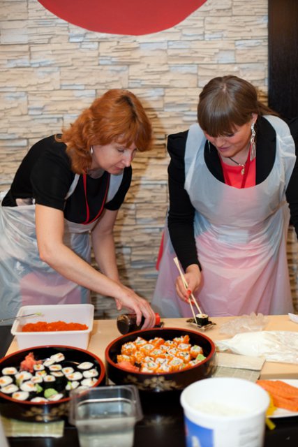 Официальная часть плавно перетекла в кулинарный мастер-класс, во время которого участники совершили увлекательное гастрономическое путешествие в мир волнующей и необычной, но от этого еще более притягательной японской кухни. Остановками кулинарного маршрута стали традиционные японские блюда: суши, сашими и роллы. Участников ждал необходимый минимум теоретической части, в ходе которой они получили ответы на вопросы: почему рис должен держать форму как спортсмен, как правильно выбрать и нарезать рыбу, что такое сервировка стола по-японски. Теория без практики суха, поэтому вскоре участников отправили в самостоятельное кулинарное плавание. Участники, познав все секреты и тонкости приготовления этих модных гастрономических шедевров, тут же применили полученные знания на практике.