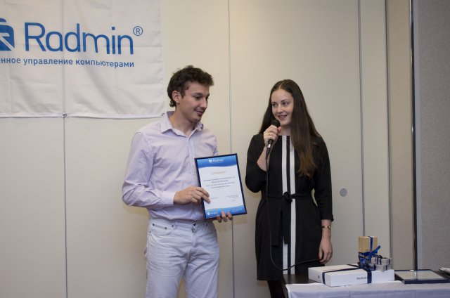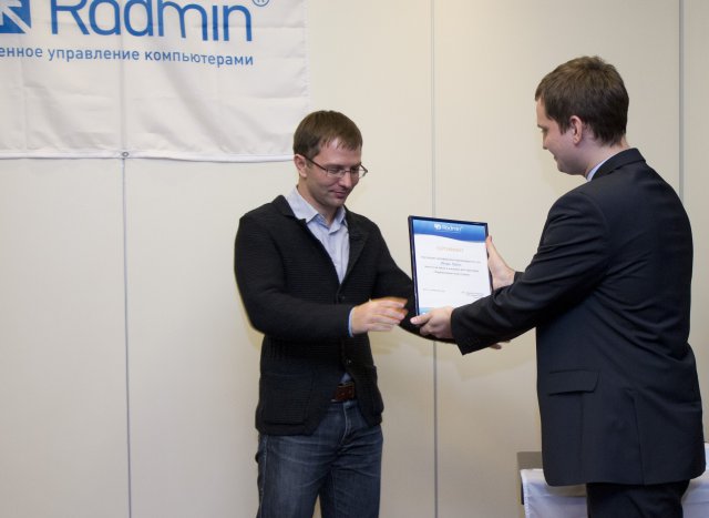 Всем призерам были вручены памятные сертификаты и ценные призы. Участники поблагодарили организаторов и поделились своим опытом продаж Radmin. Игорь Пресс (Софтмаг), победитель, занявший