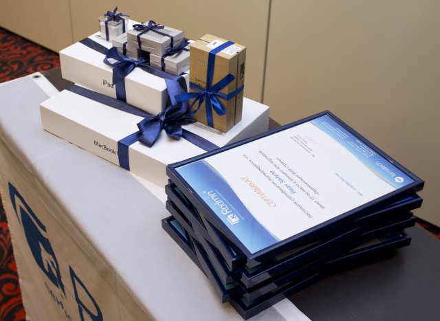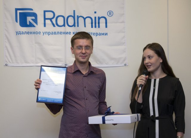 Обладатель главного приза, Apple MacBook Pro 13 с дисплеем Retina (256Gb), Михаил Долгих (ООО «СОНЕТ НН»), приехал на церемонию из Нижнего Новгорода. Как отметил Михаил, он продал 1000 лицензий Radmin филиалу ОАО «Ростелеком» в Чувашской Республике, зарегистрировал эту сделку на конкурс и в последний момент добавил 2 небольшие сделки. Именно они и обеспечили ему первое место в итоге с отрывом в 54 лицензии от Вячеслава Малунова (ITSKY), занявшего