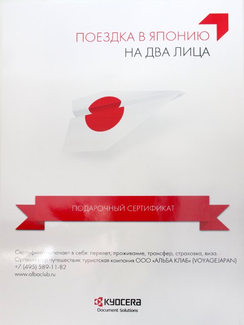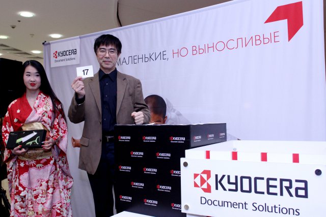 Японская компания KYOCERA Document Solutions, один из ведущих поставщиков устройств печати на российском B2B рынке (по данным аналитической компании IDC), впервые проводит в России стимулирующую лотерею для физических лиц. «У российского рынка персональных печатных устройств большой потенциал. Проведение первой в России рекламной акции для потребителей является важным шагом компании по расширению своего присутствия на рынке B2C» — комментирует новость генеральный директор, KYOCERA Document Solutions Russia, Учикура Масаказу. В лотерее приняли участие более 1000 человек. Победители лотереи были определены во время розыгрыша 5 октября в ТЦ Европейский, Москва. Главный приз — поездка в Японию на двоих. Так же среди участников были разыграны ценные призы и сувениры с символикой компании.