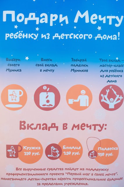 Катание на коньках — и одиночное, и парное, и хороводом, и «паровозиком», уцепившись за плюшевый хвост Муми-тролля, танцевальные флэш-мобы... Изготовление нарядных переплетов для блокнотов и новогодних открыток, роспись пряников, мастер-классы от фокусника, роспись глиняных игрушек, забавные языковые игры от Тофслы и Вифслы, географические викторины от путешественника Снусмумрика, рисовалки и мастерилки для самых маленьких... Как в настоящем Муми-доле, тут никто не скучал!