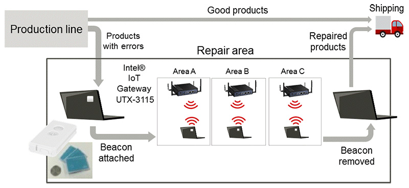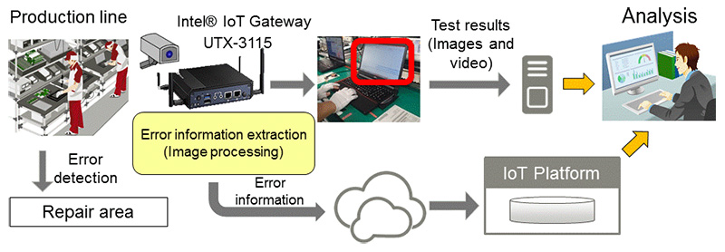Для того чтобы визуализировать процесс проверки использовалась технология обработки изображений Fujitsu Laboratories Ltd. и инфраструктура, ускоряющая разработку приложений, использующих эту технологию. Статус задачи сотрудника записывался на видео, а код ошибки (код с описанием неисправности) отображался на экране продукции, которая подлежала ремонту. Записанное видео объединялось с помощью Intel® IoT Gateway для визуализации процесса путем обработки аналитического образа. Помимо повышения эффективности объединения кодов ошибки специалисты получили возможность находить основные тенденции выявленных неисправностей и эффективно анализировать обстоятельства обнаружения неполадок. Используя результаты анализа для ограничения неправильного обнаружения дефектов, Fujitsu сможет уменьшить избыточный ремонт продукции.