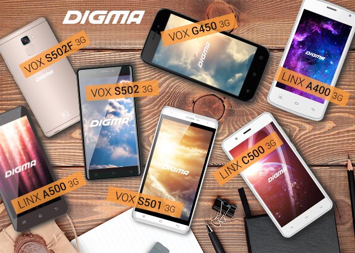 В июле ассортимент торговой марки Digma расширится новыми смартфонами двух линеек Digma VOX и Digma LINX, включающих в себя 7 моделей, отличающихся между собой дизайном, размером экрана, характеристиками, функциональностью и стоимостью. Все семь новинок работают на 4-ядерных процессорах под управлением операционной системы ANDRIOD 5.1.