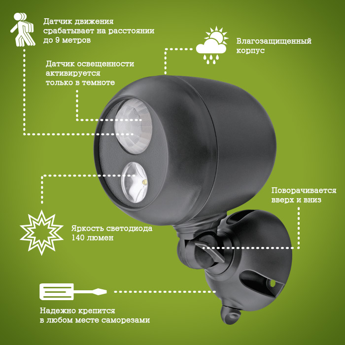 Прожектор MrBeams MB360 является идеальным выбором для домашней безопасности и энергосбережения. Его всепогодная конструкция и яркий свет позволяет хорошо работать на открытом воздухе, в беседках во дворах, в гаражах и подвалах.