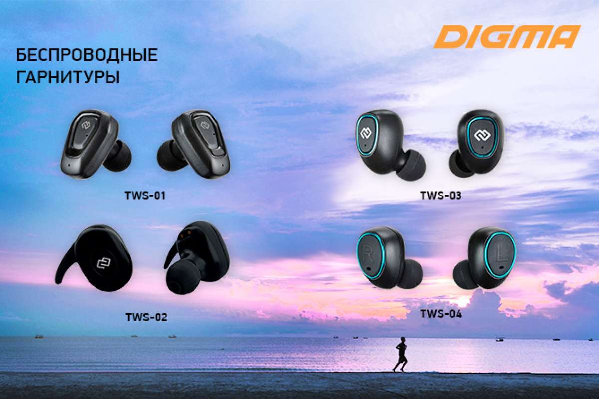Линейка полностью беспроводных гарнитур DIGMA включает в себя модели TWS-01, TWS-02, TWS-03 и TWS-04. Они отличаются друг от друга внешним видом и характеристикой встроенных излучателей, при единой структуре полностью беспроводного соединения.