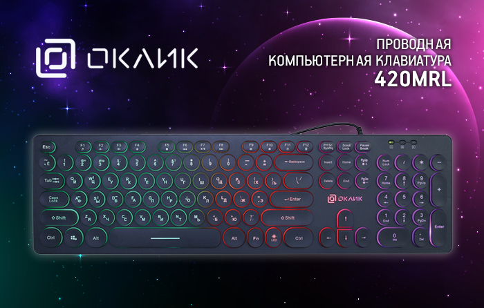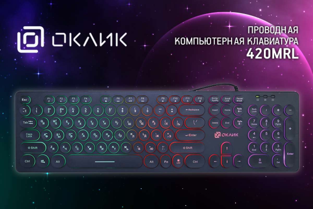 Новинка от OKLICK, о которой идёт речь сегодня — надёжное и стильное решение для офисной работы. Как и большинство продуктов «трудовой» линейки, 420MRL наделили удобным для ввода текста «ноутбучным» профилем клавиш, достаточно строгим дизайном и многоцветной — если захотелось добавить яркости рабочим будням — подсветкой.