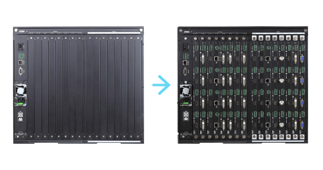 Коммутатор 𝐕𝐌𝟑𝟐𝟓𝟎 легко расширяется и обеспечен линейкой плат ввода-вывода с возможностью горячей замены от компании ATEN. Комбинирование плат обеспечивает гибкость решения и расширяет глобальные возможности использования.