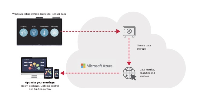 Рабочие возможности системы “Все-в-одном”, помимо активного взаимодействия с пользователем, помогают поддерживают комфортную обстановку в помещении благодаря встроенным датчикам IoT. Вы получаете актуальные данные о занятости помещения, качестве воздуха, температуре, влажности и освещении. Поддержано подключение к платформам IoT Microsoft Azure Digital Twins и Sharp WorkSpaces.