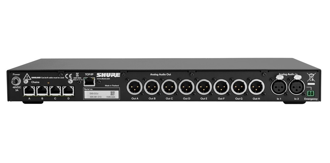 Центральный блок DIS-CCU – это универсальный контролер обеспечивающий управление и настройку систем Microflex Complete, DDS 5900 и DCS 6000. Данный блок способен управлять как небольшими системами с минимальным количеством устройств, так и расширенными системами, которые включают в себя большое количество модулей. Контроллер обеспечивает питание и управление конференц-устройствами, аналоговые аудиовходы и аудиовыходы для внешнего оборудования и Web-браузер для удаленного управления системой. Для управления в каждой системе необходимо предусмотреть один блок управления CCU. В целях унификации, простоты монтажа и дальнейшего расширения системы все элементы подключаются между собой каскадным способом посредством универсального экранированного кабеля типа FTP или STP и разъемов RJ-45.