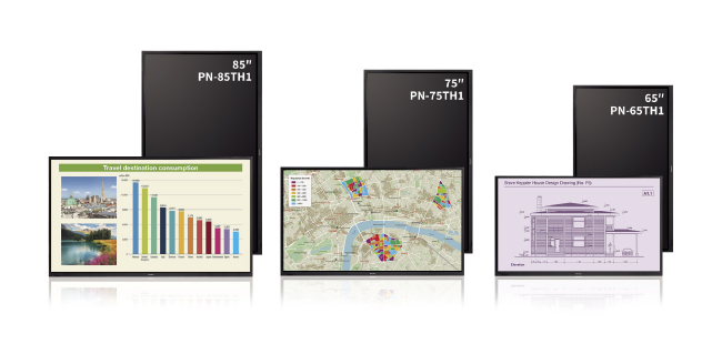 Серия PN-TH1 BIG PAD предлагает выбор из трех широкоформатных дисплеев с размером экрана 85, 75 и 65 дюймов. Наличие дисплея с разрешением 3840 x 2160 Ultra High Definition (UHD) и сенсорного экрана, оптимизированного для чтения 4K, позволяет их с успехом предлагать практически для любой офисной среды, зала заседаний или конференц-зала.