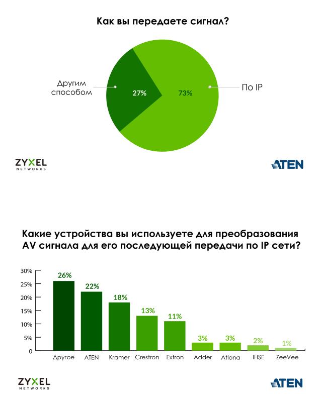 21 июня 2021 года, Москва, Россия - Стали доступны результаты исследования предпочтений IT специалистов и профессионалов AV индустрии (ProAV) при передаче аудио/видео сигнала (AV) высокого качества по локальным сетям. Опрос проведен по заказу компаний ATEN и Zyxel Networks весной 2021 года. Мероприятие приурочено к выпуску обеими компаниями на рынок России и СНГ совместного решения, в рамках которого технологии и алгоритмы преобразования и передачи AV сигнала высокого качества от ATEN интегрированы в сетевые коммутаторы Zyxel.