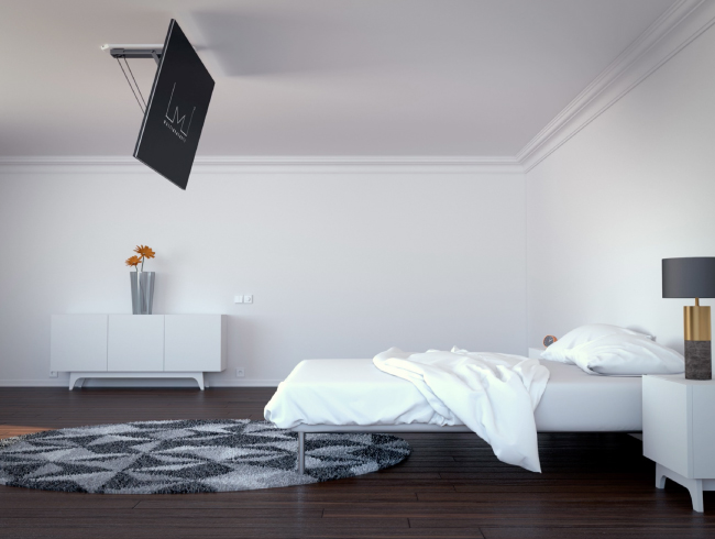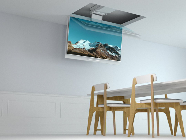 В самом верхнем положении телевизор или профессиональная панель полностью скрыты, и неосведомленный гость даже не догадается, что под потолком может находиться громадное (до 70 дюймов) устройство отображения.
