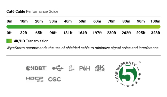 • Передача контента 4K @ 60 Гц (4:2:0) на расстояние до 100 метров по кабелю Cat6a или выше