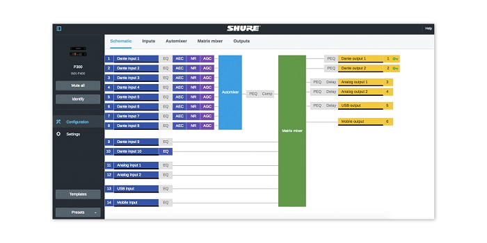 P300 предлагает несколько способов подключения – Dante® (10 входов / 2 выхода), аналоговый (2 блочных входа / 2 блочных выхода), USB (1 вход / выход) и разъем для подключения телефона (3,5мм), благодаря которым подключение к системам в помещении, ноутбуками и мобильным устройствам становится проще, чем когда-либо.