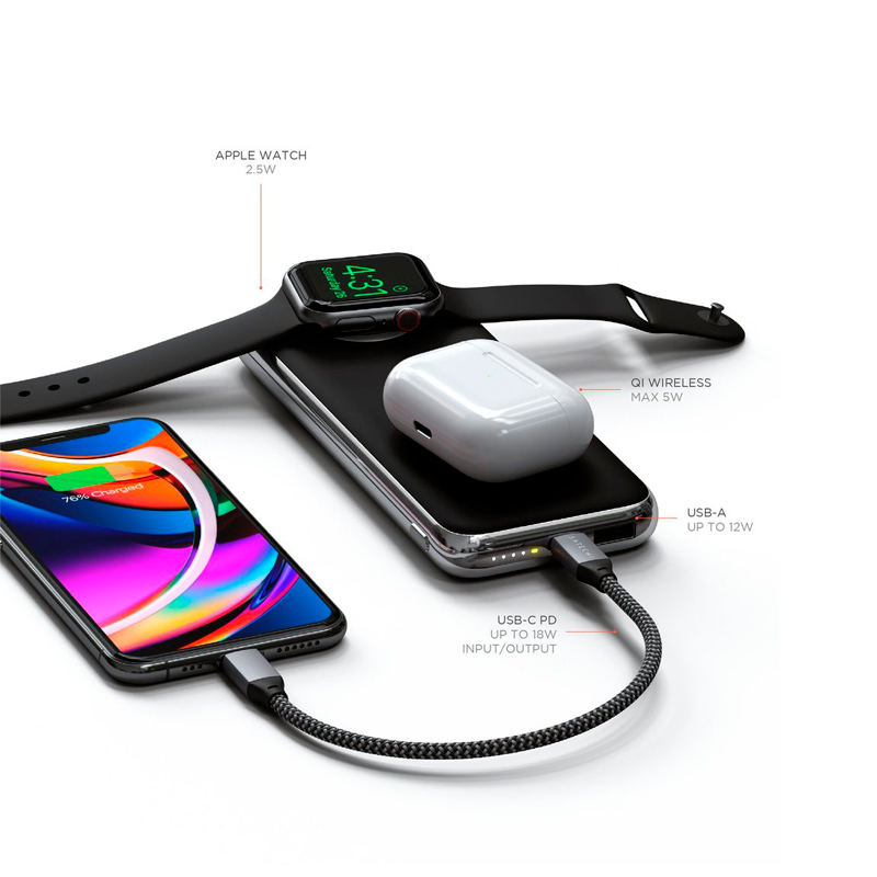 Пауэрбанк Satechi Quatro способен одновременно заряжать несколько различных устройств: он поддерживает беспроводную зарядку по стандарту Qi и имеет встроенный магнитный компонент для Apple Watch. Также прибор оснащен зарядным портом USB-C PD, который анализирует подключенное устройство, регулирует подаваемые на него силу тока и мощность, чтобы зарядить его быстрее и безопаснее.