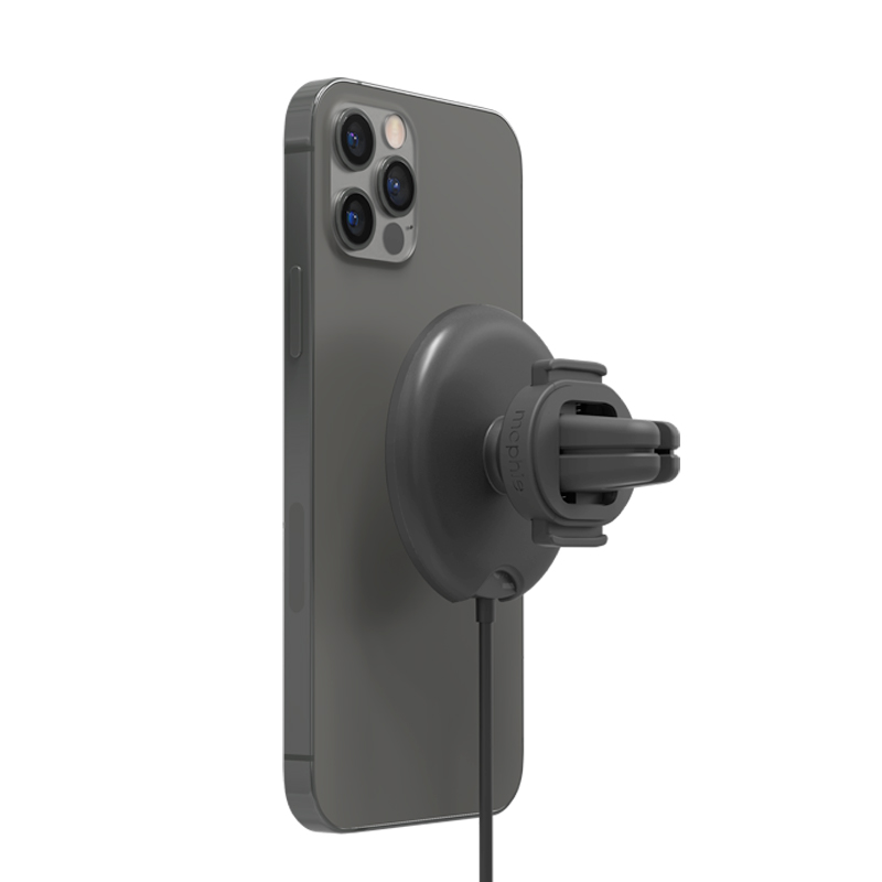 Mophie Snap Plus Wireless Vent Mount совмещает в себе беспроводную зарядку и автомобильный держатель для телефона. Магнитные крепления надежно фиксируют и удерживают смартфон в нужном положении: голосовые и видеозвонки удобнее делать в портретном режиме, а пользоваться GPS-навигатором — в панорамном. Также можно регулировать угол наклона телефона. Магнитная накладка в комплекте делает зарядное устройство совместимым практически с любым смартфоном. Mophie Snap Plus Wireless Vent Mount обеспечивает быструю зарядку до 15 Вт.