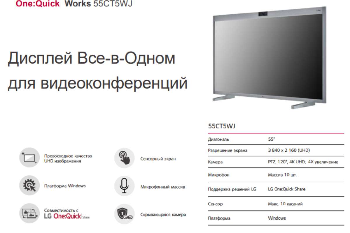 LG One:Quick Works интеграционное решение Все-в-Одном для видеоконференцсвязи. Микрофон, камера, динамики, ПК, интерактивная доска и функции безопасности и приватности совмещены в одном устройства для простого использования и управления. Все необходимое для комфортного восприятия и эффективной работы включено в одном устройстве: превосходное качество изображения, высококлассный звук, удобство эксплуатации и интеграции, безопасность и приватность и приятный пользовательский интерфейс.