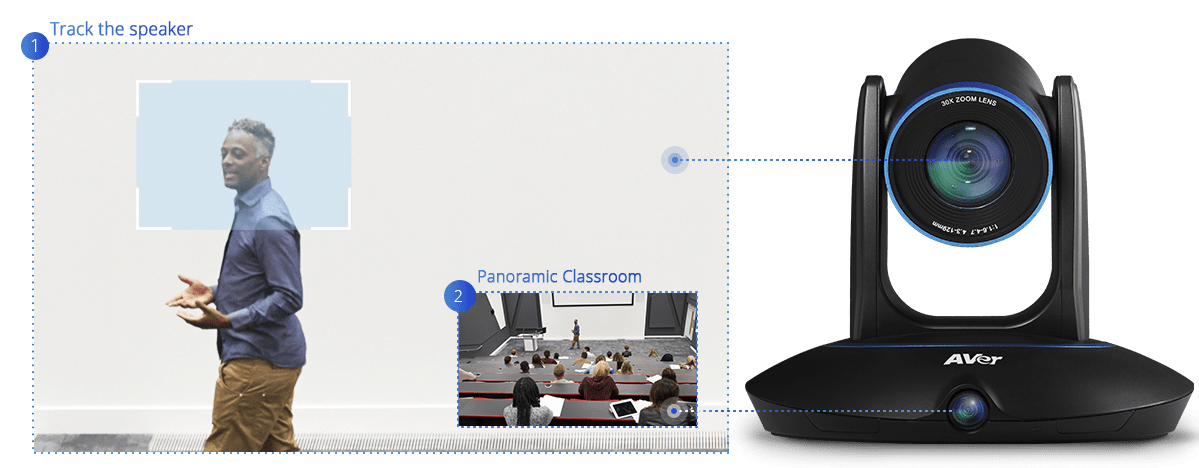 Конструкция с двумя объективами объединяет в себе PTZ-камеру и дополнительную камеру с сверх-широким углом обзора 120°, что позволяет отслеживать докладчика и одновременно вести панорамную съемку класса. Кроме того, при записи видео вы можете включить и настроить режим PIP (картинка в картинке) для одновременного отображения докладчика и остальной части аудитории. Четко представляйте все подробности урока, чтобы не пропустить моменты, полезные для обучения.