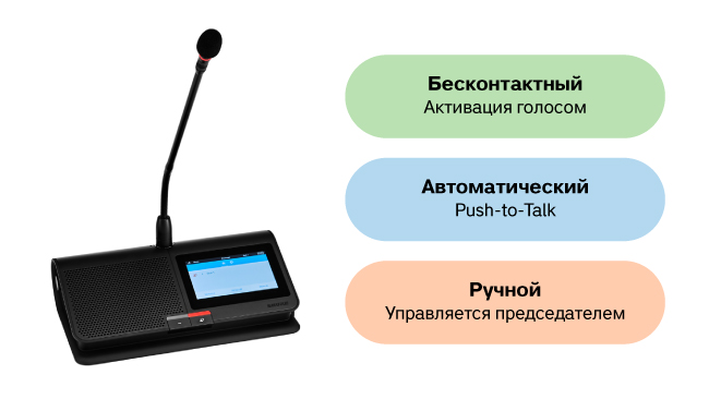 Новейшая опция — это бесконтактный режим, который доступен в прошивке версии 7.0 или более поздней. Работа в бесконтактном режиме позволяет вести разговор без каких-либо прикосновений к оборудованию и делает менее формальные встречи удобнее. В бесконтактном режиме микрофон автоматически активируется голосом, когда участник говорит, и отключается, когда он замолкает. Не нужно нажимать кнопку или ждать разрешения. Светодиод микрофона загорается, чтобы сообщить участнику, что его микрофон активен.