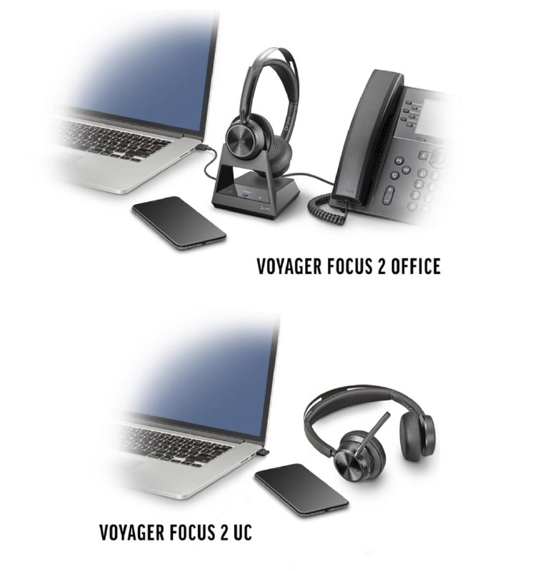 • Voyager Focus 2 Office: профессионалы, которые круглосуточно разговаривают по телефону в шумной офисной обстановке, которым требуется подключение к настольным телефонам.
