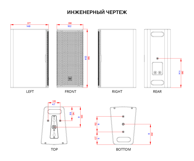 - 2 x 8-дюймовых неодимовых НЧ-драйвера, коаксиальный 4-дюймовый/2,5-дюймовый СЧ-ВЧ драйвер.