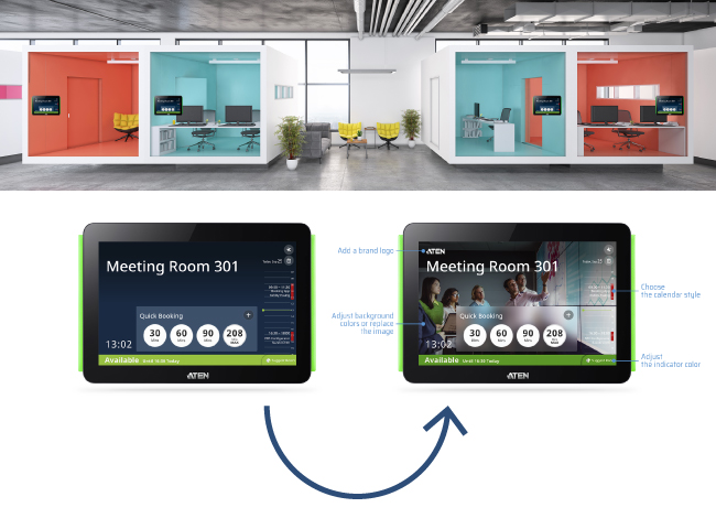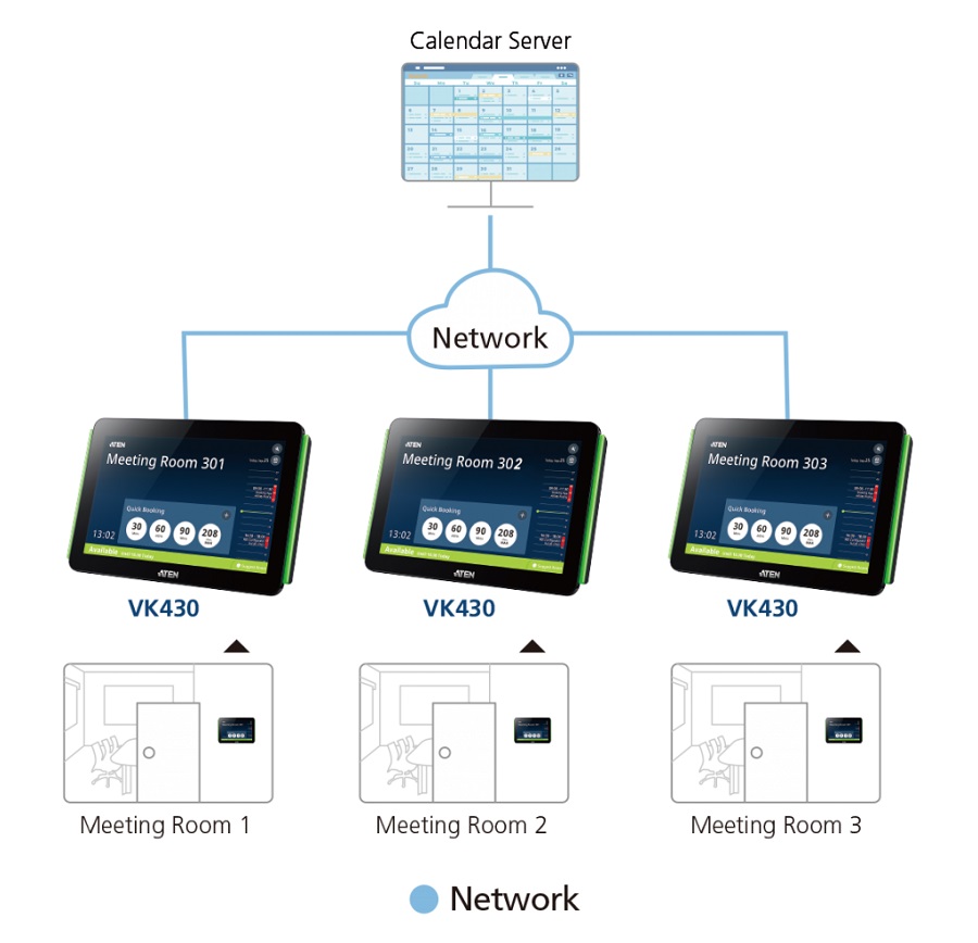 Устройство Aten VK430 представляет собой сенсорную панель с диагональю 10,1 дюйма, которая используется для управления конференц-залами. Она централизованно настраивается с помощью конфигуратора системы бронирования (RBS Configurator) – программного обеспечения для централизованного управления панелями бронирования и интеграции с серверами календарей, такими как Календарь Microsoft Office 365, обеспечивая удобное планирование и распределение доступности для всех конференц-залов, внесенных в систему. Таким образом, наделенный полномочиями персонал с помощью нескольких простых нажатий в удобном пользовательском интерфейсе, может выполнять бронирование конференц-зала, изменять сроки или освобождать использование помещения, а также незамедлительно проверять расписания бронирования любого конференц-зала. Кроме того, с помощью конфигуратора системы бронирования администраторы могут в режиме реального времени централизованно просматривать доступность и расположение всех конференц-залов, а также управлять на расстоянии каждым подключенной панелью VK430, повышая эффективность использования конференц-залов.