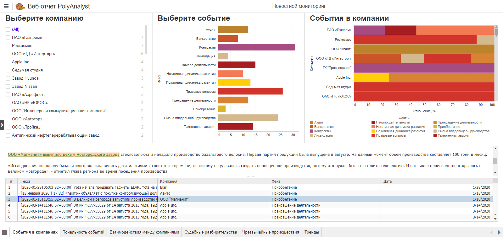 • Для корпоративных финансов - формирование прогноза спроса и контроль делового состояния контрагентов через мониторинг информации от регулирующих органов и новостного потока и многое другое.