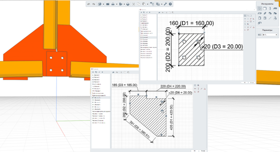 Используя функциональность Renga, можно проектировать металлоконструкции зданий и сооружений различного уровня сложности. Инструмент «Сборка» позволит создать отправочные марки ферм, колонн, связей и т. д. и применять их в разработке конструктивных схем зданий и сооружений. Удобные 3D-привязки и трехмерные режимы измерения существенно увеличат точность и ускорят процесс позиционирования конструктивных элементов относительно друг друга. Редактор профилей избавит от необходимости искать нестандартные сечения конструктивных объектов на различных ресурсах. Можно за считанные минуты создавать любые профили металлоконструкций и использовать их в своих проектах.