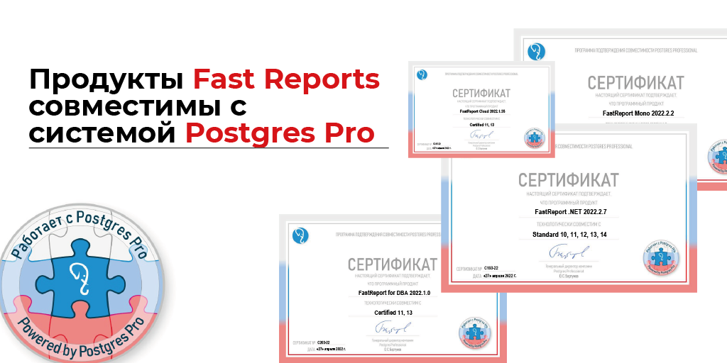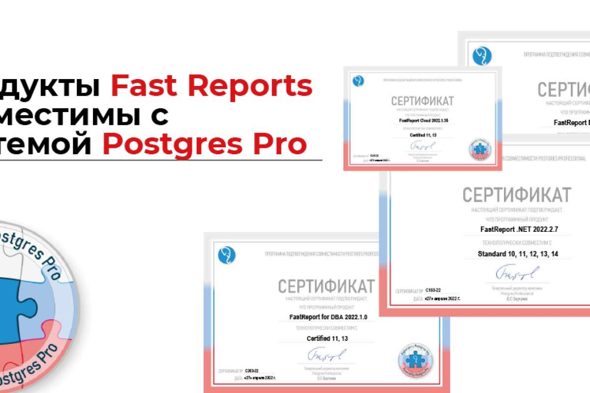 Последние версии продуктов FastReport .NET, FastReport Mono, FastReport Open Source, FastReport Core, FastReport for DBA, FastReport Cloud и FastReport Corporate Server совместимы с Postgres Pro.