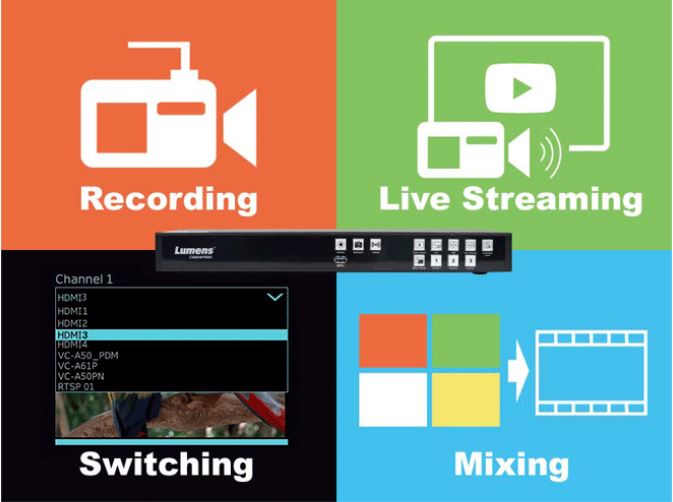 Инновационный медиа-процессор Lumens CaptureVision System LC200 предназначен для записи и потоковой передачи в режиме реального времени, с возможностью микширования, кодирования и переключения до 4 HDMI или 3 источников IP-видео и 4 источников звука. LC200 может выполнять резервное копирование видеофайлов на сервер или осуществлять потоковую передачу на большинство облачных видеохостингов. Система предназначена для сферы образования, корпоративном, правительственном, здравоохранении, церквях и других приложениях.