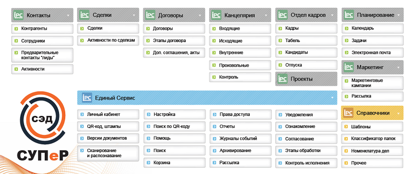 Система состоит из функциональных модулей, которые полностью обеспечивают автоматизированный документооборот в большинстве компаний и учреждений: делопроизводство, управление персоналом, ведение договоров и проектов, взаимодействие с клиентами и партнерами, помогает накапливать и систематизировать корпоративные знания, организовывать и анализировать маркетинговые мероприятия. Для уникальных потребностей предприятия мы можем дополнить систему новыми функциями или целыми программными модулями.