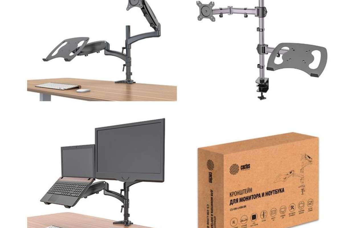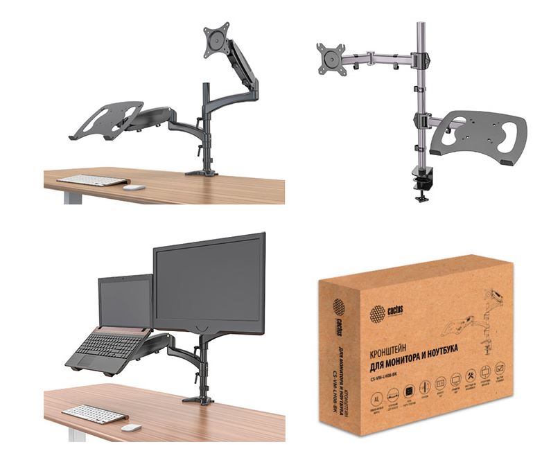 Настольные кронштейны для ноутбука и монитора Cactus подходит для ЖК- мониторов с диагональю экрана от 13 до 27 дюймов и весом до 8 кг. Кронштейн позволяет легко и плавно изменять ориентацию монитора поворачивая и наклоняя его.
