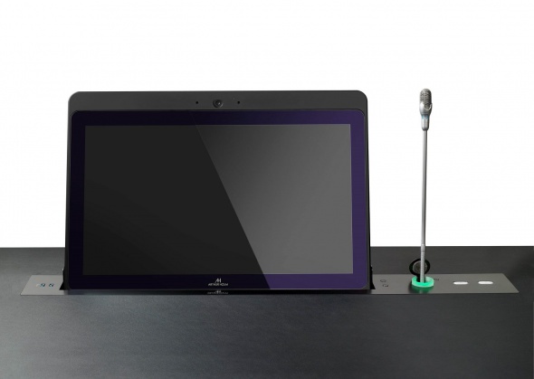 Профессиональный выдвижной 21.5" широкоформатный монитор Full HD с функцией автоматического наклона 20° предназначен для встраивания в стол. Корпус выполнен из анодированного алюминия, экран монитора защищен антибликовым стеклом с черной окантовкой. Монитор интегрирован с лифтовой системой доя микрофона DynamicTalk. DynamicTalk является универсальной моторизованной системой подъема микрофона типа «гусиная шея». У основания микрофона расположено светодиодное кольцо, показывающее делегату, когда можно говорить в микрофон. Управление выдвижными устройствами производится дистанционно через RS 422 или GPI.