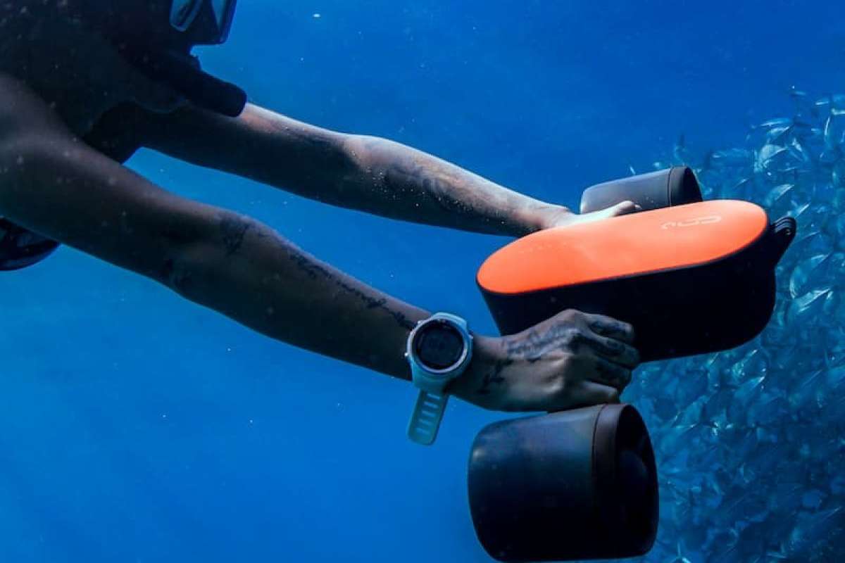 Подводный скутер — гаджет, позволяющий дайверам преодолевать большие расстояния, не затрачивая много сил. Благодаря этому девайсу ныряльщик сможет исследовать большую площадь за меньшее время, не устать на полпути и сделать красивые кадры морских глубин.