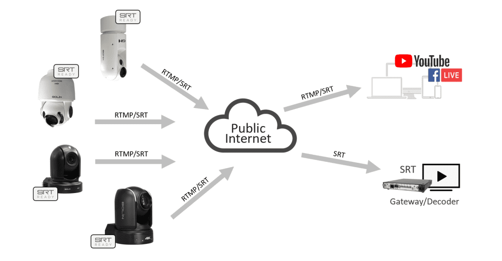 - Доставка высококачественного и безопасного видео с малой задержкой через общедоступный Интернет. SRT оптимизирует производительность потоковой передачи в непредсказуемых сетях благодаря безопасным потокам и простому обходу брандмауэра, обеспечивая лучшее качество живого видео в нестабильных сетях.