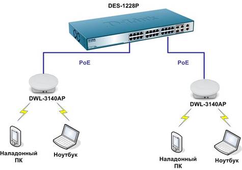Коммутатор DES-1228P позволяет подключать до 24 точек доступа DWL-3140 с возможностью одновременного обслуживания до 200 беспроводных клиентов.